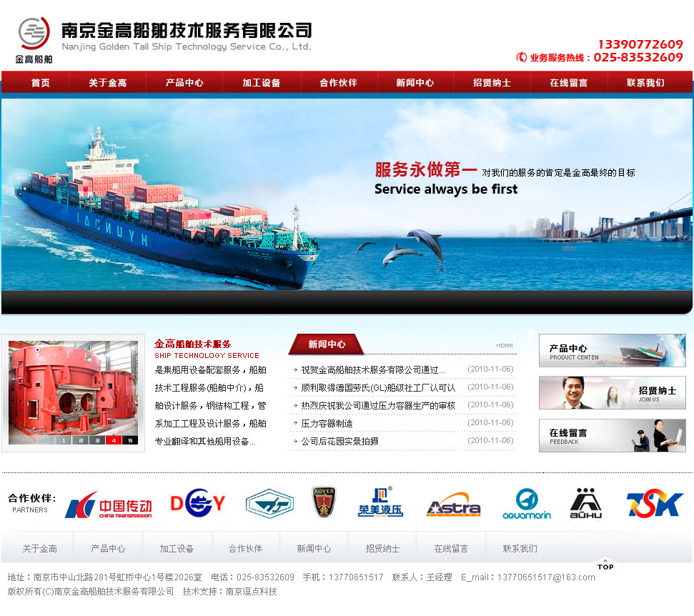 南京金高船舶技術(shù)服務(wù)有限公司是集船用設(shè)備配套服務(wù),船舶技術(shù)工程服務(wù)(船舶中介),船舶設(shè)計(jì)服務(wù),鋼結(jié)構(gòu)工程,管系加工工程及設(shè)計(jì)服務(wù),船舶專業(yè)翻譯和其他船用設(shè)備的服務(wù)公司。本公司與國內(nèi)多家大型船廠和大型鋼結(jié)構(gòu)企業(yè)有著良好的合作關(guān)系,其中包括南京武家嘴船廠,江蘇鼎衡船業(yè),江蘇科進(jìn)船業(yè),南京高精船用設(shè)備公司,鎮(zhèn)江同舟螺旋槳公司,滁州(南京)大益船舶,南通沿江管業(yè)公司。本公司還與國內(nèi)多家船舶設(shè)計(jì)院有著良好的關(guān)系,設(shè)計(jì)院包括上海船舶研究設(shè)計(jì)院、上海佳豪船舶設(shè)計(jì)院、中國船舶工業(yè)第七零八研究所、上海恒波設(shè)計(jì)公司、南京歐海船舶科技公司等。本公司管理層致力于中國船舶業(yè)的發(fā)展,把船舶配套服務(wù)作為公司發(fā)展的主線。使本公司代理的南高齒的船用推進(jìn)系統(tǒng)能廣泛的運(yùn)用到全世界的船舶上。本公司的宗旨是:優(yōu)質(zhì)服務(wù),誠信做人,互惠互利,共同發(fā)展。目的是促進(jìn)國產(chǎn)船用設(shè)備的發(fā)展和提高國產(chǎn)船用設(shè)備的市場占有率。